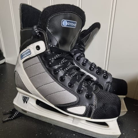 Ishockeyskøyter i størrelse 42 sammen med hjelm. Skøytene har hvit skøytestål, svart overdel og snøring foran. De er egnet til ishockeybruk eller generell skøyting på is. Hjelmen er svart med innvendig polstring og justerbar stropp under haken, egnet til bruk på is for ekstra hodebeskyttelse.