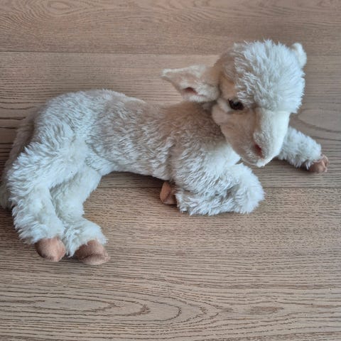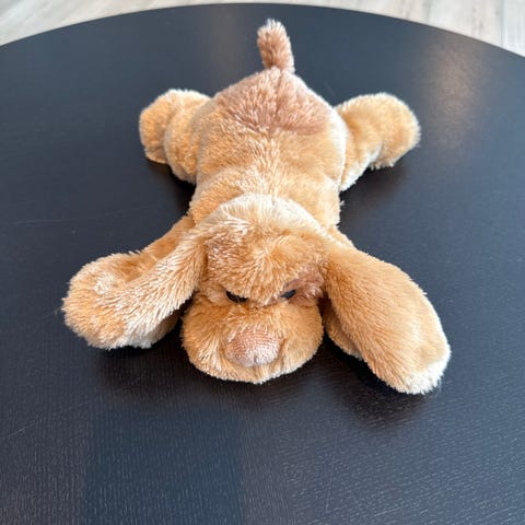 Myk hvit kosedyrhund med plysjmateriale. Passer som leketøy eller dekorasjon.