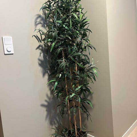 Kunstig plante i bambus-stil med grønne blader. 150 cm høy. Planten står i en rillemønstret potte og egner seg som dekorasjon i stue, gang eller kontor. Passer som innredningselement i ulike interiørstiler.