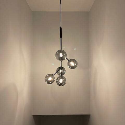Ny og aldri brukt. Kun montert nå for å ta bilde. Kjøpte denne for å bytte om på kuplene. Denne hadde opprinnelig mørkt glass, men byttet til hvitt glass fra den andre lampa.