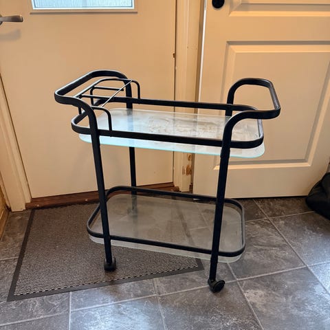 Bord med to etasjer på hjul. Fine trilleegenskaper på jevne overflater/gulv. Fungerer bra til servering eller til plantebord.