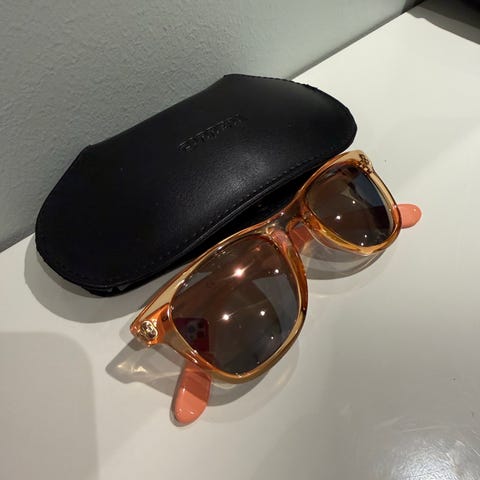Vintage Carrera solbriller for unisex med rektangulær innfatning. Brillene har mørke glass og blå, mønstret plastinnfatning med Carrera-logo på stengene. Egnet som solbeskyttelse og til hverdagsbruk.