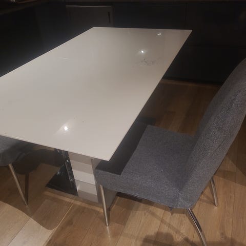 Selger et pent brukt hvitt spisebord med fire tilhørende stoler. Perfekt størrelse for familie eller deg som liker å ha gjester på middag 🥰