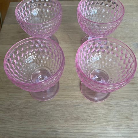 Villeroy og Boch champagner glass.kjøpt for 239 selges fir 175 pr stk. solide glass. Kan brukes som dessertskål eller vannglass. 12 cm høye. 40 cl