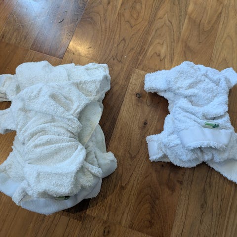 Tøybleier av typen lommebleier (en av merket apple cheeks str 2, en av merket little lamb str 2, fem stk uten merke). Lommebleiene er vanntette, men trenger absorberende innlegg inni som det er 12 av (merket apple cheeks) sender også med to flotte innlegg i tillegg.