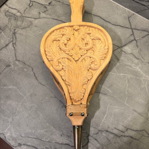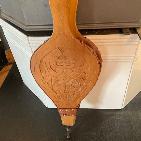 Peisbelg og dekorativ treboks i utskåret treverk med metall-detaljer. Peisbelgen har motiv på oversiden og metalltut i front. Treboksen har utskåret mønster på lokket og rektangulær form. Egner seg til bruk ved peis eller som dekorative gjenstander i interiøret.