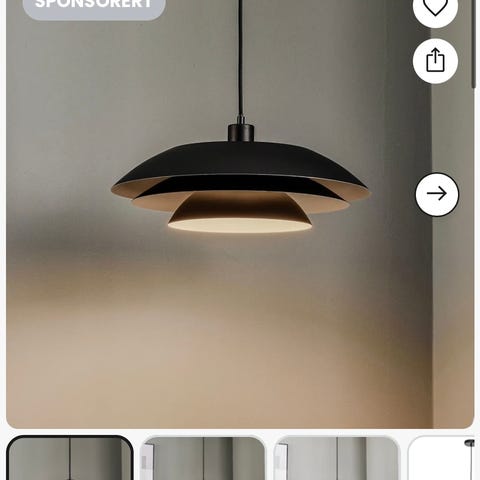 Bohus pendellampe med tre nedhengte lampeskjermer. Lampen har en horisontal stang i kromfarget metall og hvite glasskjermer med dekorative mørke linjer. Opphenget består av to vaieroppheng festet til en rektangulær takboks. Pendellampen er egnet over spisebord, kjøkkenøy eller i gang, og bruker standard ledlyspære i hver skjerm (se sokkeltype på selve lampen). Designet er funksjonelt med fokus på jevn belysning over et avlangt område. Hentes i Molde!