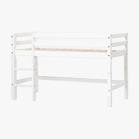 Rammen er i malt tre/trebasert materiale. Du får med et matchende hvitt nattbord med skuff og skapdør. Det er noen merker og slitasje på overflater på både seng og nattbord, men ingenting å si for bruken. Egner seg som seng eller sofa-/gjesteseng på barnerom eller gjesterom.