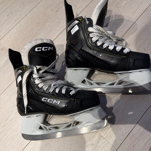 CCM ishockeyskøyter for barn i størrelse 36 (US 3 / 22,6 cm). Skøytene har regular bredde og er laget for ishockeybruk. Fargekombinasjon hovedsakelig svart med hvite lisser og detaljer. Passer til barn som trenger stabile og støttende ishockeyskøyter til trening eller lek på isen.