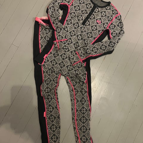 Kari Traa ullundertøysett for dame i størrelse XS. Sett med overdel med høy hals og glidelås foran samt bukse med strikk i livet. Laget i ull med blå bunnfarge og mønstret design, med kontrastpaneler i sidene. Egnet som varmt og isolerende lag under yttertøy ved ulike uteaktiviteter og hverdagsbruk.