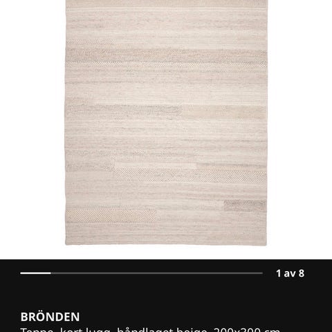 Teppet er håndlaget i 100 prosent ull og i en dyp, mørk gråfarge som passer godt til både lyse og mørke gulv. Teppet er ca. 8 år gammelt, har vært brukt i røykfritt hjem uten husdyr og er jevnlig støvsugd.