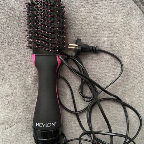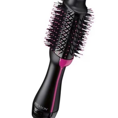 Revlon One-Step hårføner og styler er en elektrisk hårbørste som kombinerer føn og styling i ett verktøy. Modellen har en flat, rektangulær børstehode-utforming med plastbust og luftåpninger for jevn varmefordeling. Enheten er ledningsbasert og beregnet til tørking og forming av hår. Fargen er hovedsakelig svart med detaljer i kontrastfarge. Passer til daglig hårpleie og enkel styling hjemme.