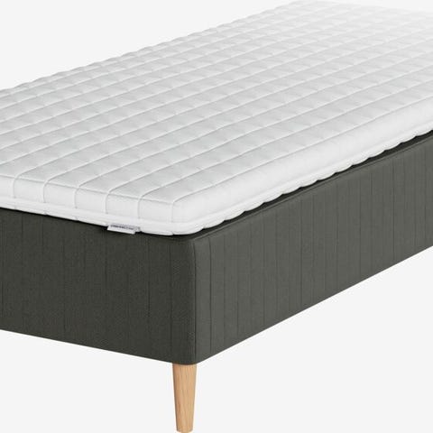 DUX seng i nøytral tekstilfarge. Rammekonstruksjon med bein og overmadrass. Gammel seng, brukt siste halvannet år, men lite brukt som gjesteseng før det. Hard madrass. Overmadrass og bein følger med.