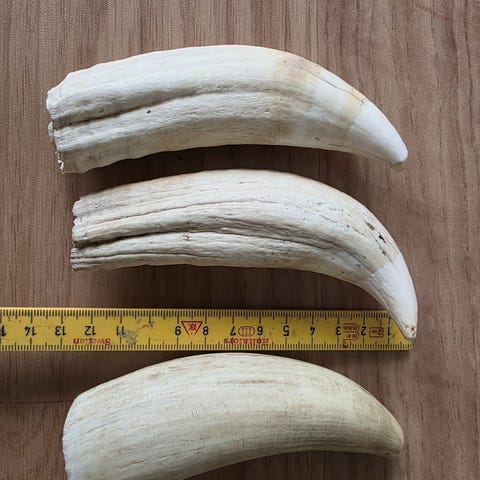 Kremfarget hvaltann, uten synlige skader. Vekt 413 gram og 21 cm