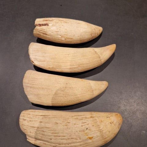 Hvaltennene er uten synlige skader. Den ene er lys kremfarget med jevn farge rundt hele. Vekten er 413 gr. Den andre er gulere med innslag av mørkere gult i felt. Vekten er 292