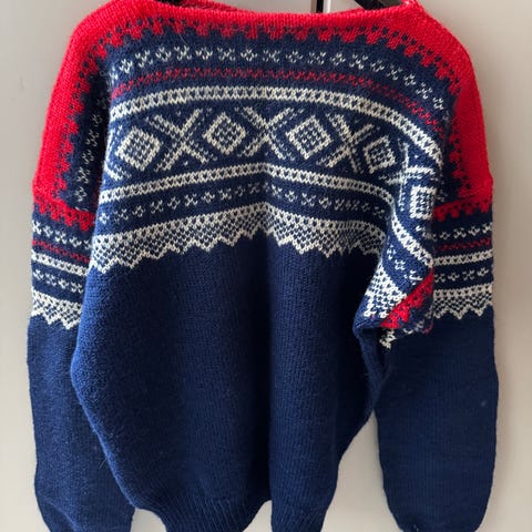Marius-ganser, usikker på størrelse, se bilder for mål. Strikket i ull. Lite brukt.