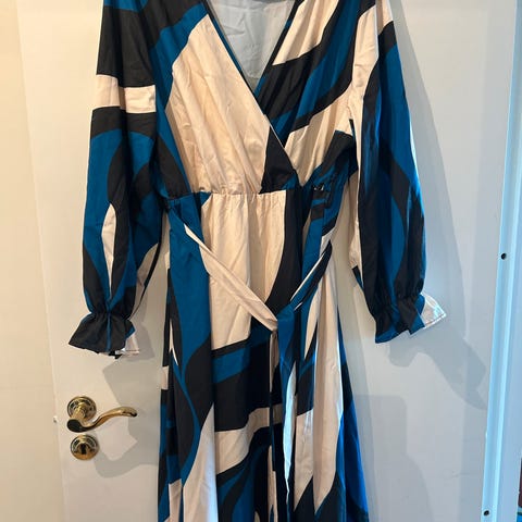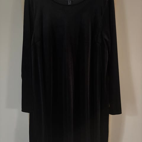 Blå kjole for dame i størrelse XXL. Kjolen har en løs og rett passform med enkle linjer og middels lange ermer. Egner seg til hverdagsbruk eller enkle, pene anledninger. Materialet fremstår som lett og fallende syntetisk stoff.