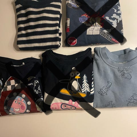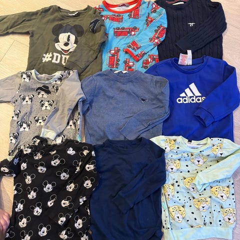 Klespakke gutt str 98/104 og 104. Noen små flekker på noen av klærne, men mye er flekkfritt. Se bilder. Røykefritt og dyrefritt hjem.