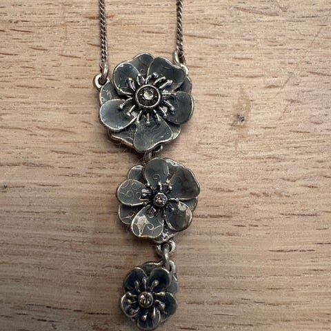 Pilgrim smykke for dame i sølvbelagt materiale med perledetaljer. Smykket består av to tynne kjeder med anheng, et blomsterformet anheng og et lite anheng med perle. Hovedmaterialet er sølvbelagt metall kombinert med perle.