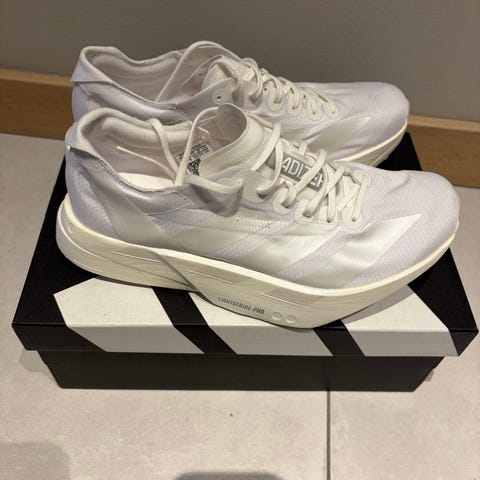 Selge mine Adidas Adizero Adios pro 4 str 43 US 9,5 må rydde sko kaoset mitt dessverre, litt for mye sko 🥹 disse er brukt på 4 mølle korte økter, fantastisk demping og respons i disse 😍