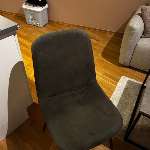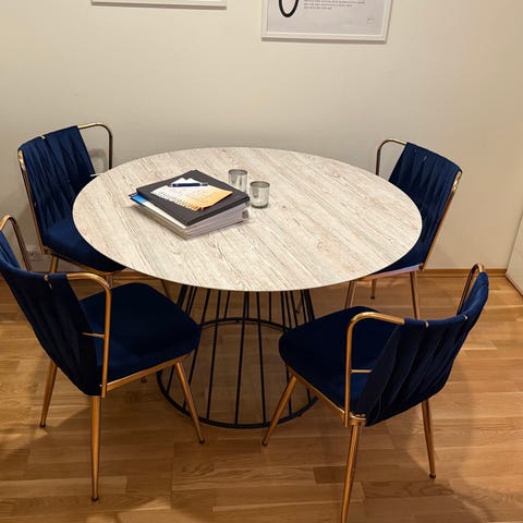 Solid spisebord med noe bruksmerker fra eureka og 6 stoler fra trademax selges samlet.