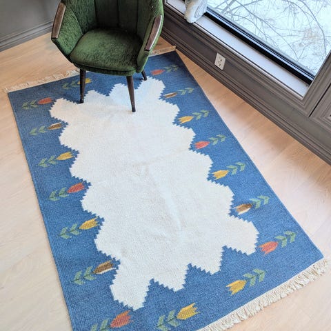 Svensk flatvevd teppe i ull, i kjent Röllakan design tulip.