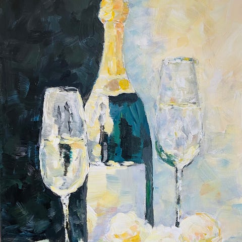 Blomsterbilde malt på lerret i blå og rosa toner. Motivet viser abstrakte blomster i rosa, hvitt og grønt mot mørk blå bakgrunn. Maleriet har kvadratisk format og kan brukes som veggdekor i ulike rom, som stue, soverom eller gang. Passer både alene og sammen med andre bilder i en bildevegg.