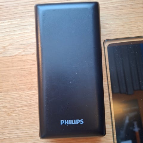20000 mAh. 2 standard USB-porter hvorav 1 er løs men kan kanskje fikses. 1 USB-C-port, og 1 Mikro-USB-innport.