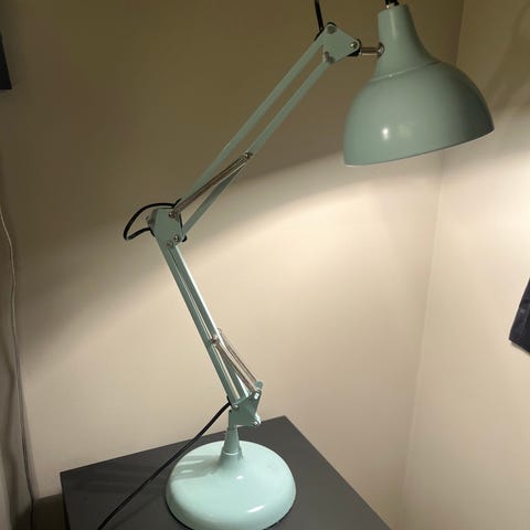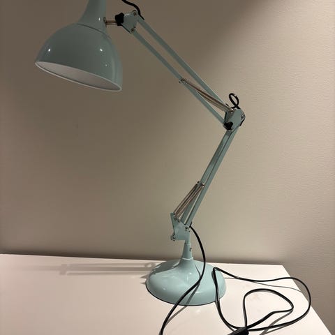 Lyseblå bordlampe som passer fint til et skrivebord selges for 250 kr. Kan hentes i Oslo.