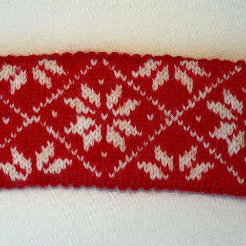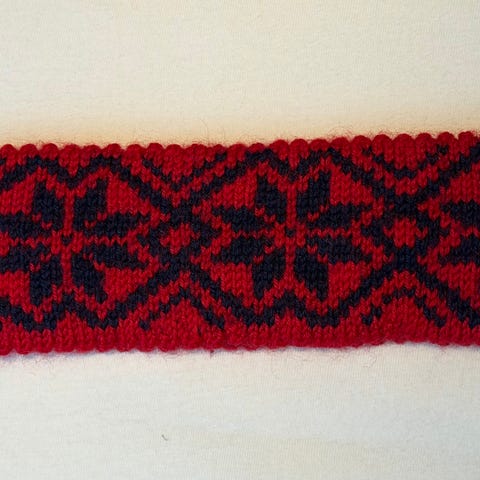 Pent brukt pannebånd i håndstrikket ull, str S til salgs. Rosa bunnfarge med gult og rødt mønster. Bredde 24,5 cm, høyde 7,5 cm. Ikke røyk/dyr.