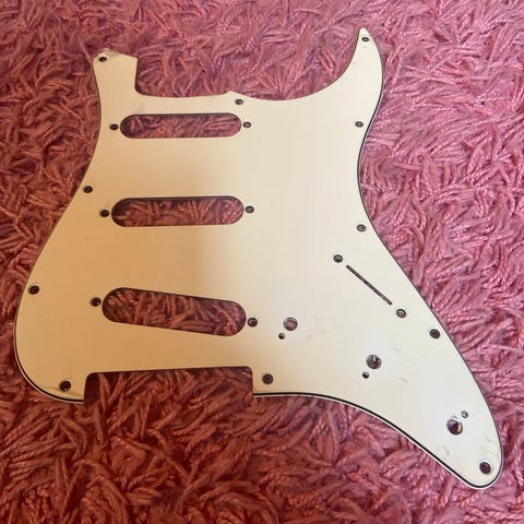 Gulnet pickguard til Strat. SSB og i det hele tatt. Sikkert stått på Squier, eller Morgan. Usikker på dimensjoner, ta gjerne kontakt så skal jeg ta mål.