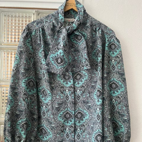 Str 46-48, en riktig tekkelig bluse med knyting i halsen.