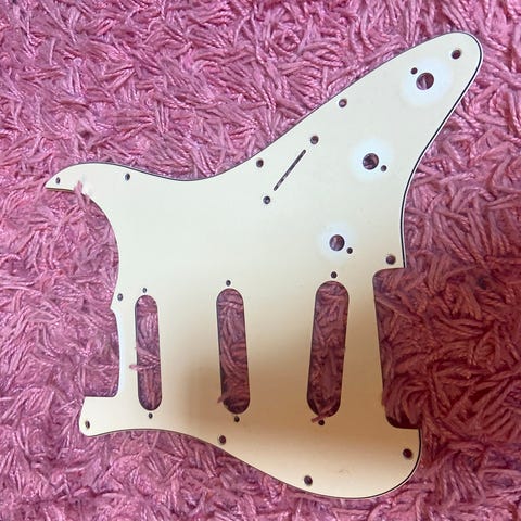 Hvitt pickguard til Strat. Plasten er fortsatt på. SSB osv. Ta gjerne kontakt, så skal jeg finne dimensjonene.