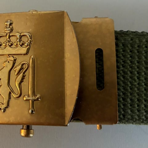 Grønt tekstilbelte med justerbar lengde og metallspenne i messingfarge. Beltet har en enkel klikkspenne med preget motiv på fronten. Passer til hverdagsbruk, fritidsklær eller turklær der man ønsker et robust og praktisk belte i stoffmateriale.