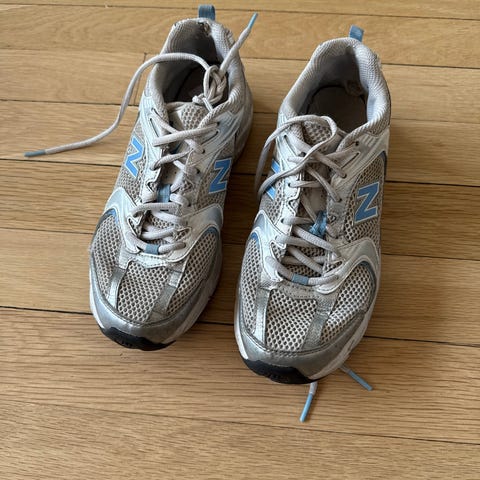 New Balance 530 i størrelse 42. Skoene ble kjøpt som en gave til partneren når han skulle i pappaperm, kjøpt brukt, men de blir aldri brukt så selger de igjen for halvparten av det jeg betalte.