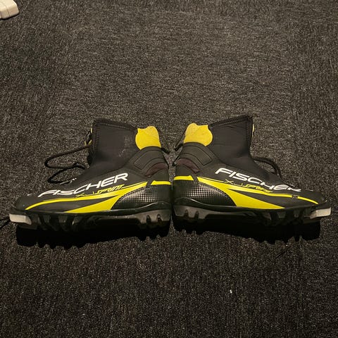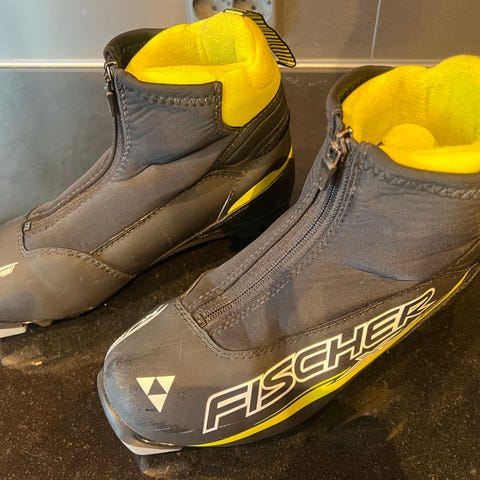 Fischer langrennsstøvler i gul og rød farge med svarte detaljer. Støvlene har snøring med beskyttende klaff over vristen og høyere skaft for bedre støtte rundt ankelen. Egnet til klassisk langrenn. Yttermateriale ser ut til å være en kombinasjon av syntetisk materiale og tekstil. Passer til bruk i preparerte løyper. Størrelse og bindingssystem er ikke oppgitt og bør kontrolleres før kjøp. Størrelse 38, passer til Salamon bindinger
