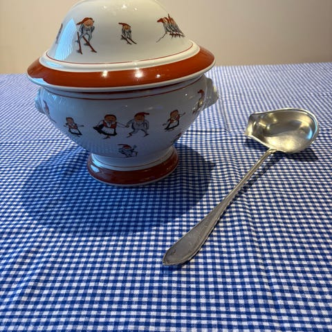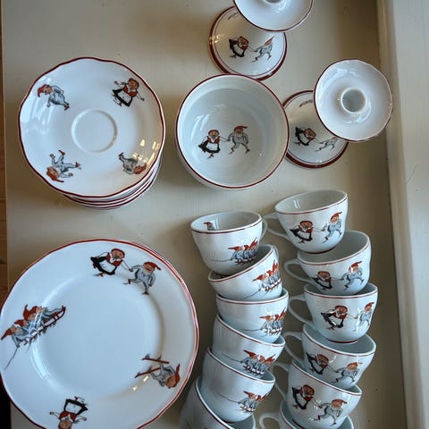 Pp servise i porselen med nisse figurmotiv. Serviset består av ulike deler som tallerkener, skåler, kopper med skål, sausnebb, terrin og serveringsfat, eggeglass, bokser og endel røde kniv og gafler. Passer til bruk i kjøkken og spisestue, og kan settes sammen til et komplett dekketøy for 6 personer.