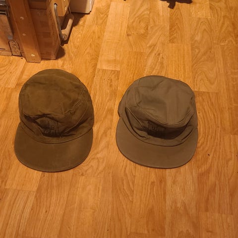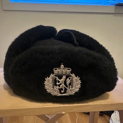 Forsvaret feltlue i grønn farge, størrelse 59. Lua har skinnbrem og skinnbånd rundt, samt innvendig skinnsvettebånd med perforeringer. Innsiden er fôret. På siden sitter knapp med Forsvarets emblem, og foran er det festet et brodert riksvåpen-emblem. Egnet som del av uniform, til samling eller rekvisittbruk.