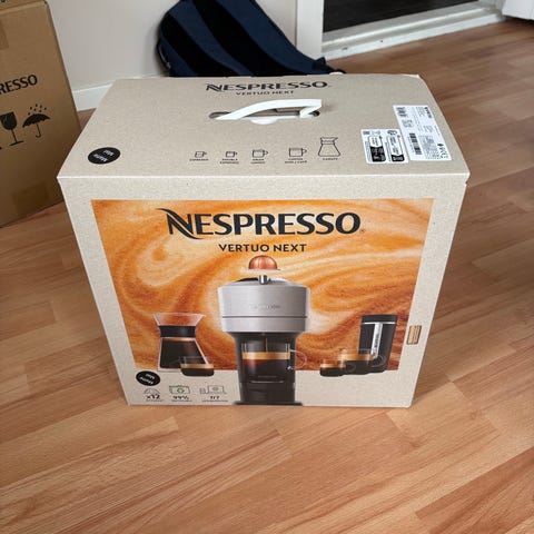 Nespresso Vertuo Next kaffemaskin i turkis og svart utførelse med detaljer i metall. Maskinen bruker Nespresso Vertuo-kapsler og har avtakbar vanntank plassert bak. Dryppbrett kan tas av for å tilpasse ulike koppstørrelser. Egnet for brygging av ulike kaffevarianter avhengig av kapseltype. Lite brukt, fordi jeg bruker kaffe trakter.