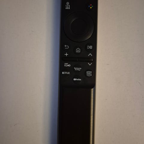 fjernkontroll i svart farge. Fjernkontrollen har egne knapper for blant annet Netflix, Samsung TV Plus, Disney+ og Prime Video, samt standard navigasjons- og volumknapper. Samsung TV-modeller