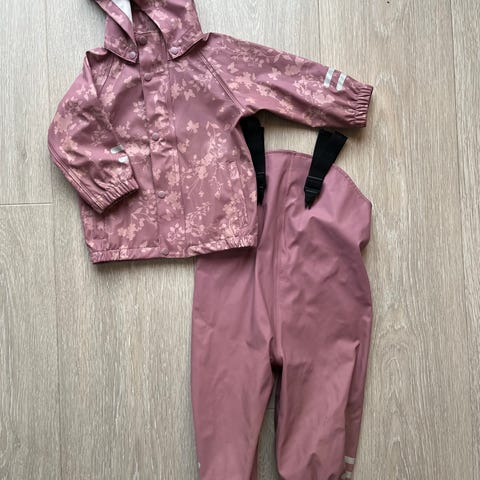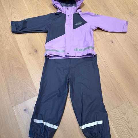 Reflex regntøysett for jente i størrelse 98 cm. Sett med jakke og bukse i lilla polyester. Jakken har avtakbar hette, glidelås foran med stormklaff og trykknapper, samt elastikk nederst og ved ermer. Buksen har elastikk i livet og forsterkede felt på knærne. Begge deler har refleksdetaljer for bedre synlighet. Egnet som regntøy til barnehage og utelek.