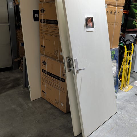 Innerdør i trefiber med brun overflate. Døren har utsparing for dørhåndtak og låskasse.