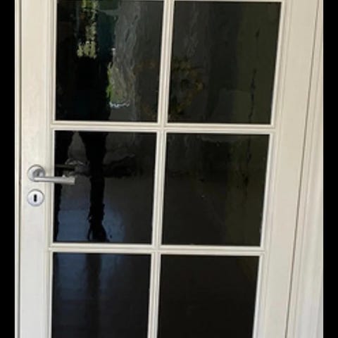 Innerdør med stort, strukturglassfelt. Døren har malt ramme og glassfelt som slipper lys gjennom samtidig som det gir skjerming. Det følger også med to sidefelt med likt glass.