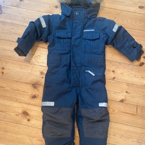 Didriksons vinterdress/ kjeledress for barn i størrelse 120. Kjeledressen er blå. Modellen har hette med fuskepelskant, forsterkede felt på knær og sete samt refleksdetaljer. Ifølge merkelappen er plagget vanntett. Egnet som yttertøy til bruk i barnehage, skole og utelek i kjøligere vær.