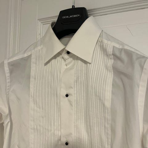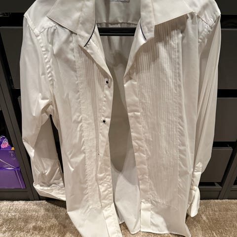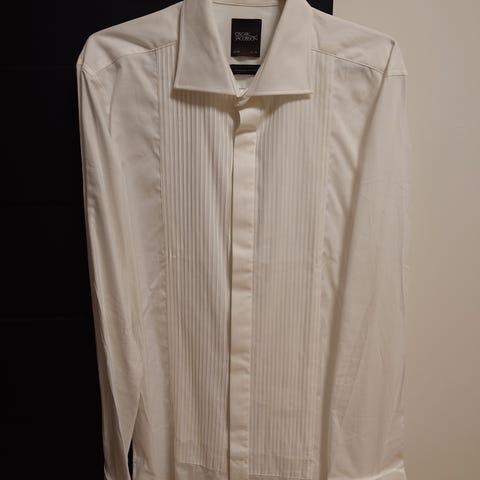 Eton smokingskjorte for herre i størrelse 42. Skjorten har dobbel mansjett, men mangler mansjettknappene som fulgte med.