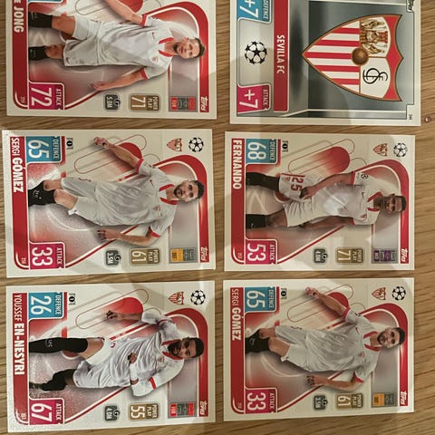 Topps fotballkort samling med ulike kort fra Premier League og FC Barcelona.