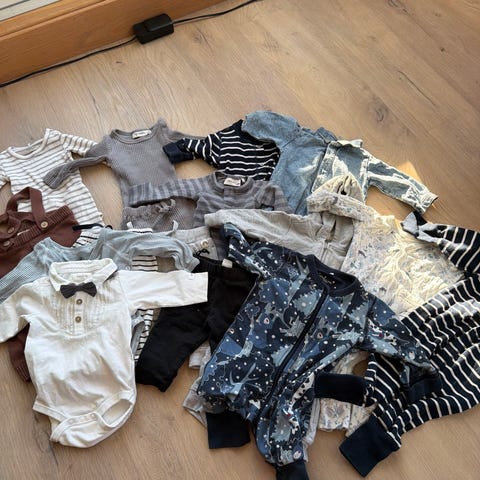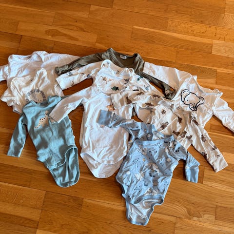 Selger bodyer i bomull str 92. Brukte av to barn. Noe har flekker eller hull og noe har ingen slitasje. Alle er i bomull.