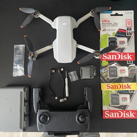 DJI Mavic Mini drone i hvit farge. Kompakt, sammenleggbar drone med kamera i front. Leveres med fjernkontroll og beskyttende koffert med formtilpassede rom til drone, kontroller og tilbehør. På bildene vises også en batterilader/batteriholder med plass til flere batterier. Egnet for foto og video fra lufta i hobbybruk og fritid. Tre batterier. Brukt mellom 5 og 10 ganger.
