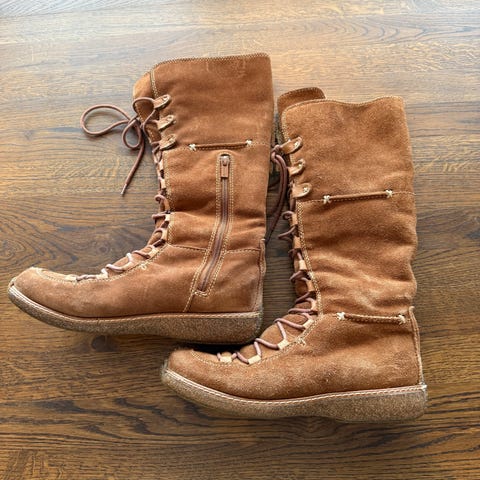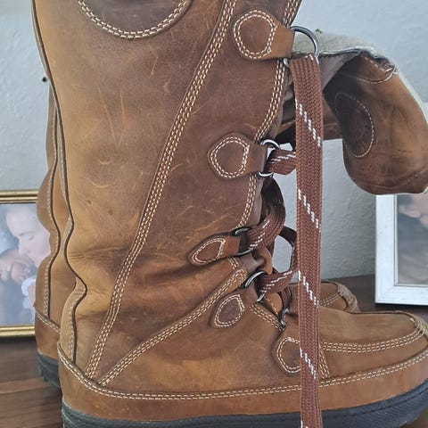 Timberland støvler i størrelse 39. Høye snørestøvler i brun farge, med flere metallringer for snøring foran. Mykt, semsket yttermateriale og polstret kant øverst. Egnet til bruk i kjøligere vær og til hverdagsbruk utendørs.