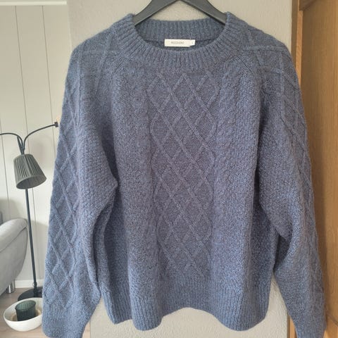 Jeg selger en fin, strikket genser fra Noella, str XS/S. Den er gråmelert med pent strikket mønster foran. 60% akryl, 10% ull, 10% mohair, 30% nylon